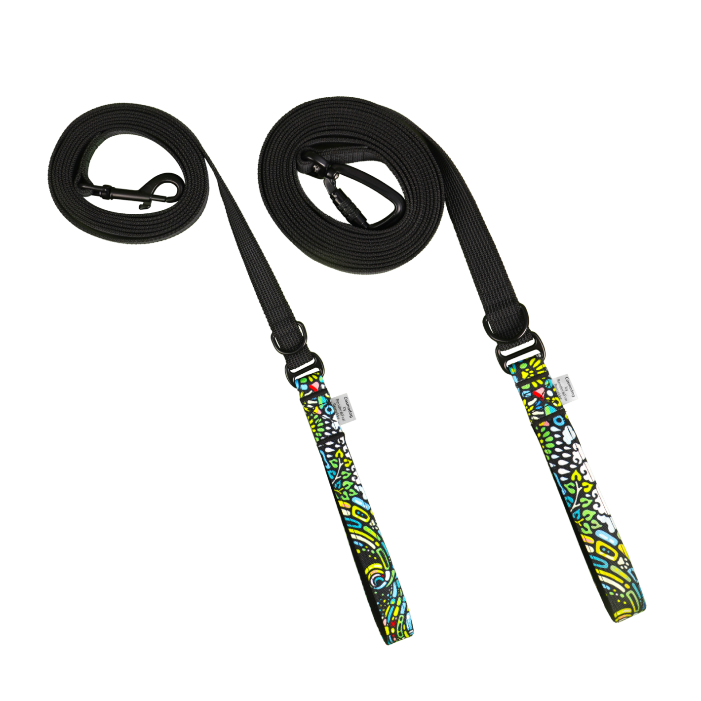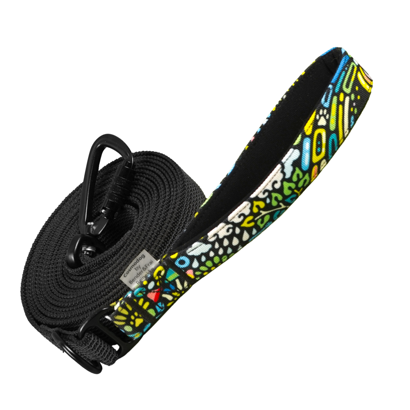 Поводок выполнен из прорезиненной стропы черного цвета и удобной мягкой ручкой с принтом и оснащен алюминиевым карабином с автофиксатором. Прорезиненная стропа не скользит в руке и не впитывает воду, а мягкая ручка не режет руку владельца даже если собака сильно тянет или дёргает. Алюминиевый карабин с автофиксатором гарантирует дополнительную надёжность: выдерживает разрывную нагрузку до 400 кг. И не расстегнётся при рывке. Поводок подходит для прогулок в любую погоду (температура эксплуатации от -25 до +40 градусов Цельсия). Изделие можно и нужно стирать, соблюдая рекомендации указанные на бирке товара.